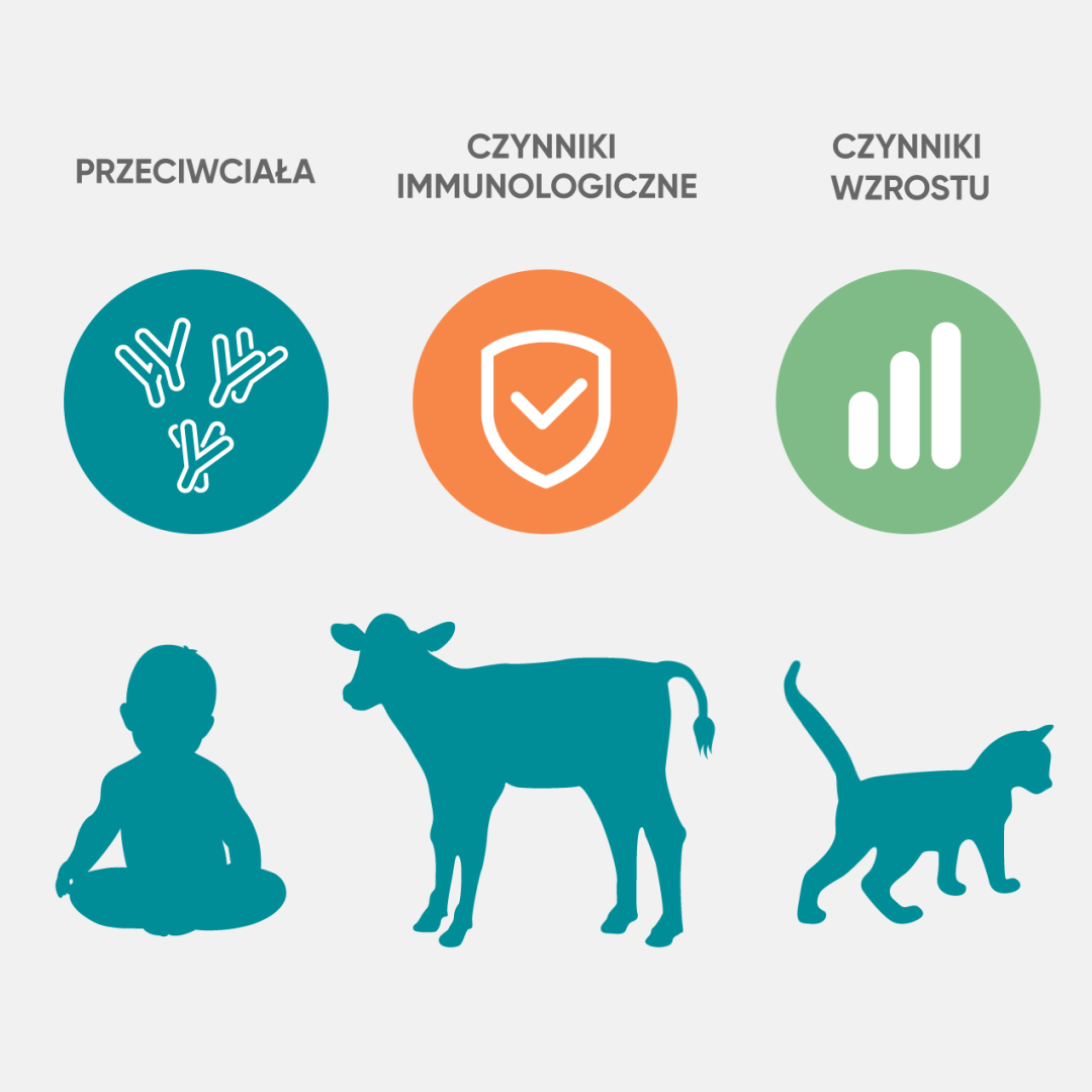 Obecność związków immunologicznie aktywnych wywiera korzystny wpływ na układ odpornościowy u ludzi w każdym wieku. Liczne prace podkreślają korzystny wpływ colostrum na układ odpornościowy zarówno u ludzi jak i u zwierząt [12]. Colostrum w swoim składzie zawiera laktoferynę, α-laktoalbuminę, lizozym, laktoperoksydazę, polipeptyd bogaty w prolinę i kazeinę. W jego składzie wykazano również obecność immunoglobulin IgA, IgD, IgE, IgG, IgM[13,14].